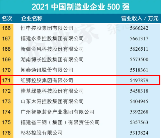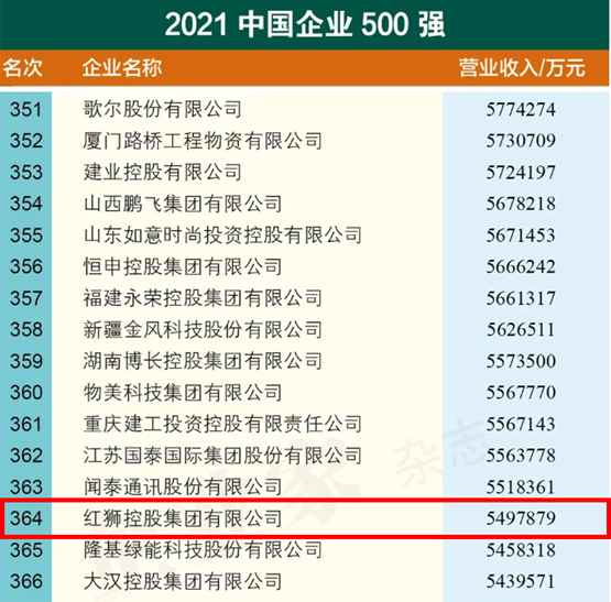紅獅集團位列2021中國企業500強第364位、 中國制造業企業500強第171位