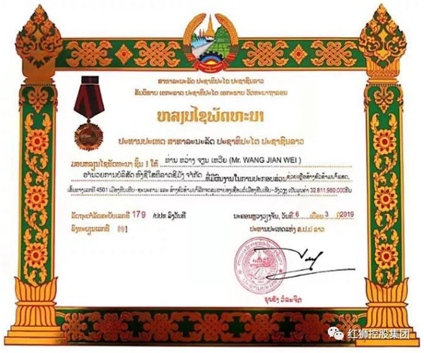 由老撾國家主席簽發的“國家一級發展勛章”證書