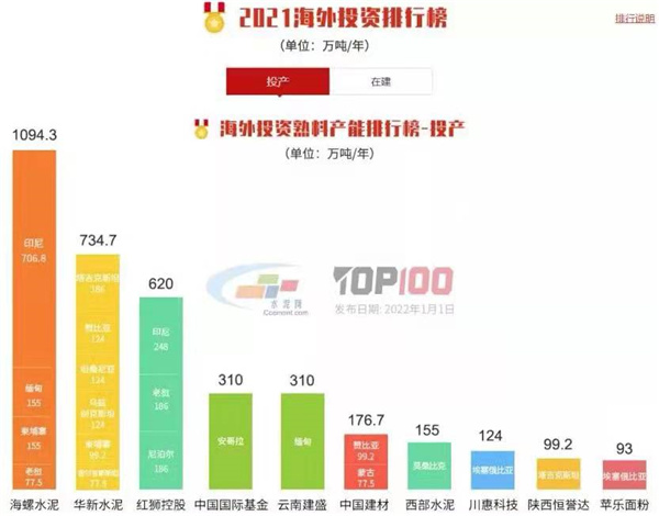 排行說明: 1、此榜單數(shù)據(jù)統(tǒng)計(jì)截至2021年12月31日中國企業(yè)在海外投資并已建成投產(chǎn)、或在建的新型干法熟料生產(chǎn)線產(chǎn)能,不統(tǒng)計(jì)其他窯型及粉磨站產(chǎn)能。2、生產(chǎn)線按設(shè)計(jì)產(chǎn)能計(jì)算:日產(chǎn)能*310天/10000(萬噸/年)。3、合資企業(yè)產(chǎn)能計(jì)入實(shí)際運(yùn)營管理方。4、產(chǎn)能相同時(shí)按企業(yè)名稱拼音首字母序排列。5、此排行僅以水泥網(wǎng)收集數(shù)據(jù)統(tǒng)計(jì),如有錯(cuò)漏之處歡迎指正。