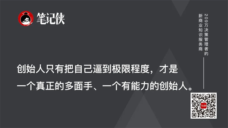 所以創(chuàng)始人只有把自己逼到極限程度,他才是一個(gè)真正的多面手,才是一個(gè)有能力的創(chuàng)始人。