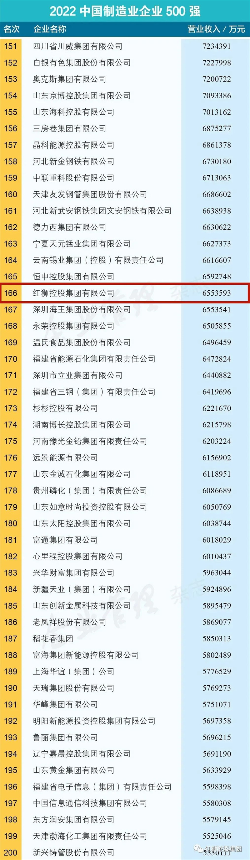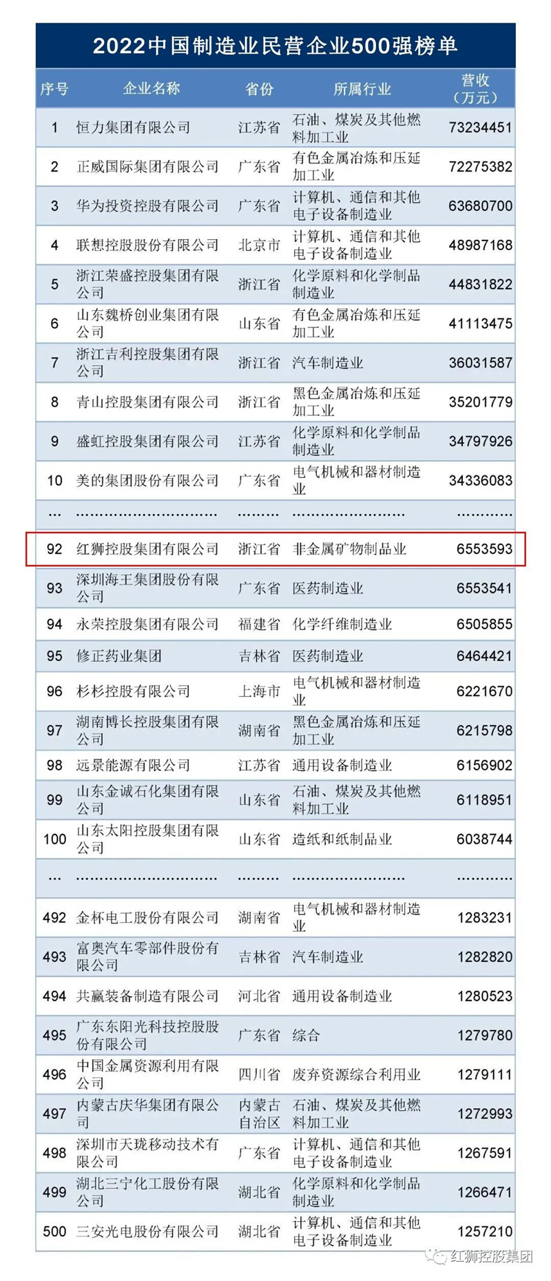 紅獅集團位列2022中國企業500強第348位、中國民營企業500強第154位