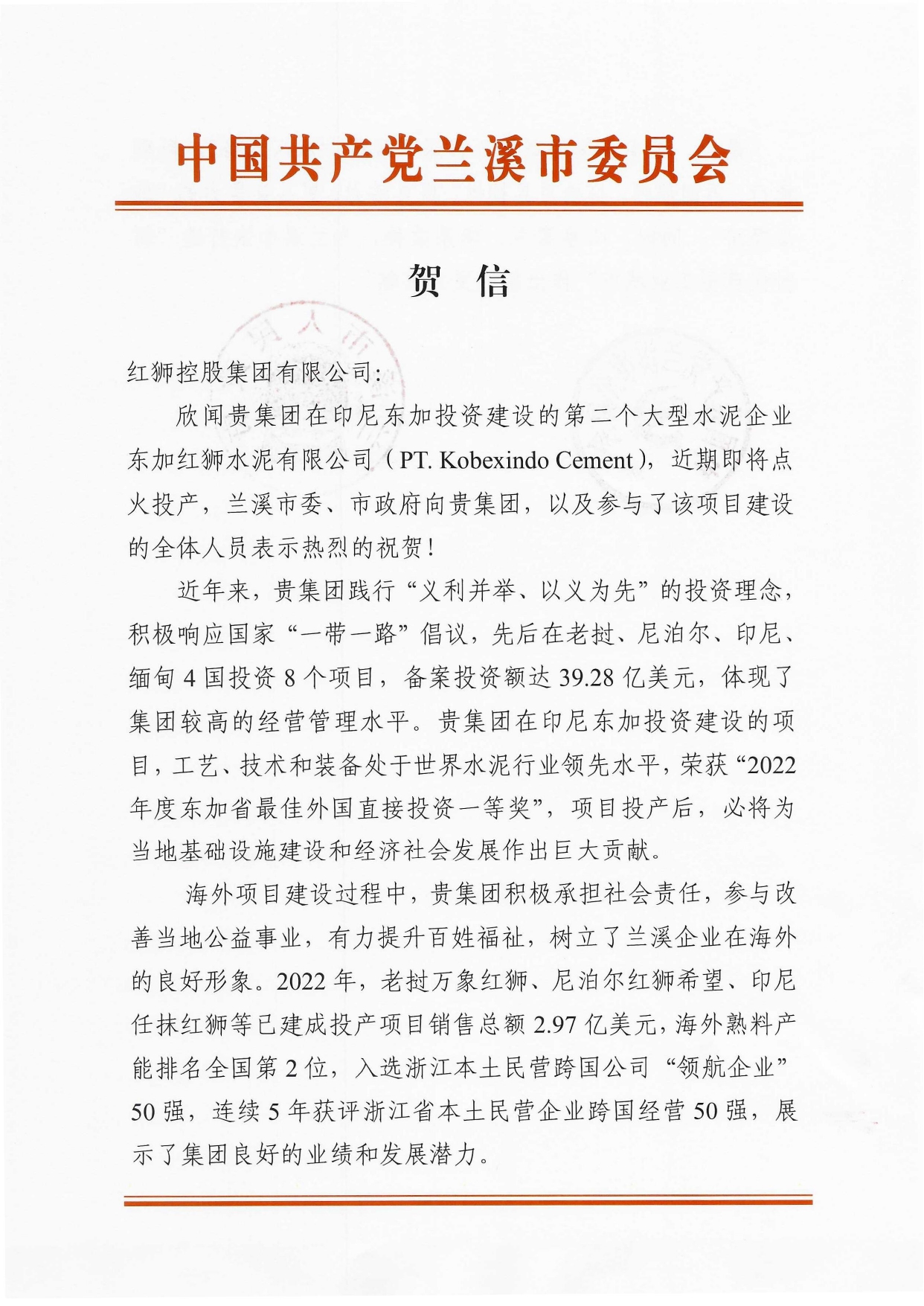 蘭溪市委市政府向紅獅集團(tuán)印尼東加紅獅水泥項目點火投產(chǎn)發(fā)來賀信