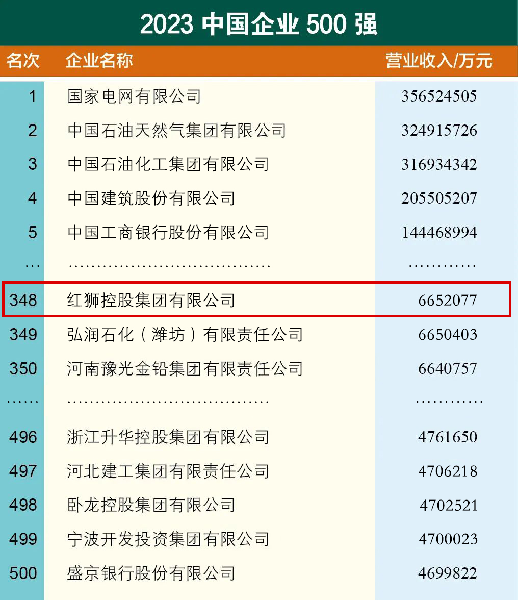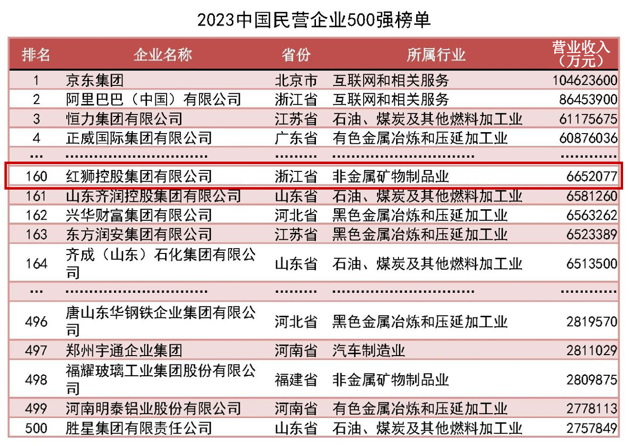 紅獅集團位列2023中國企業500強第348位、中國民營企業500強第160位