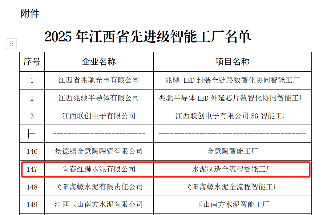 日前,江西省工業和信息化廳正式發布《2025年江西省先進級智能工廠名單公告》,紅獅集團旗下宜春紅獅憑借卓越的智能制造水平,成功獲評"江西省先進級智能工廠"稱號。這一榮譽不僅是對宜春紅獅數字化轉型成果的充分認可,更是紅獅集團"數智強企"在產業端落地見效的生動實踐。