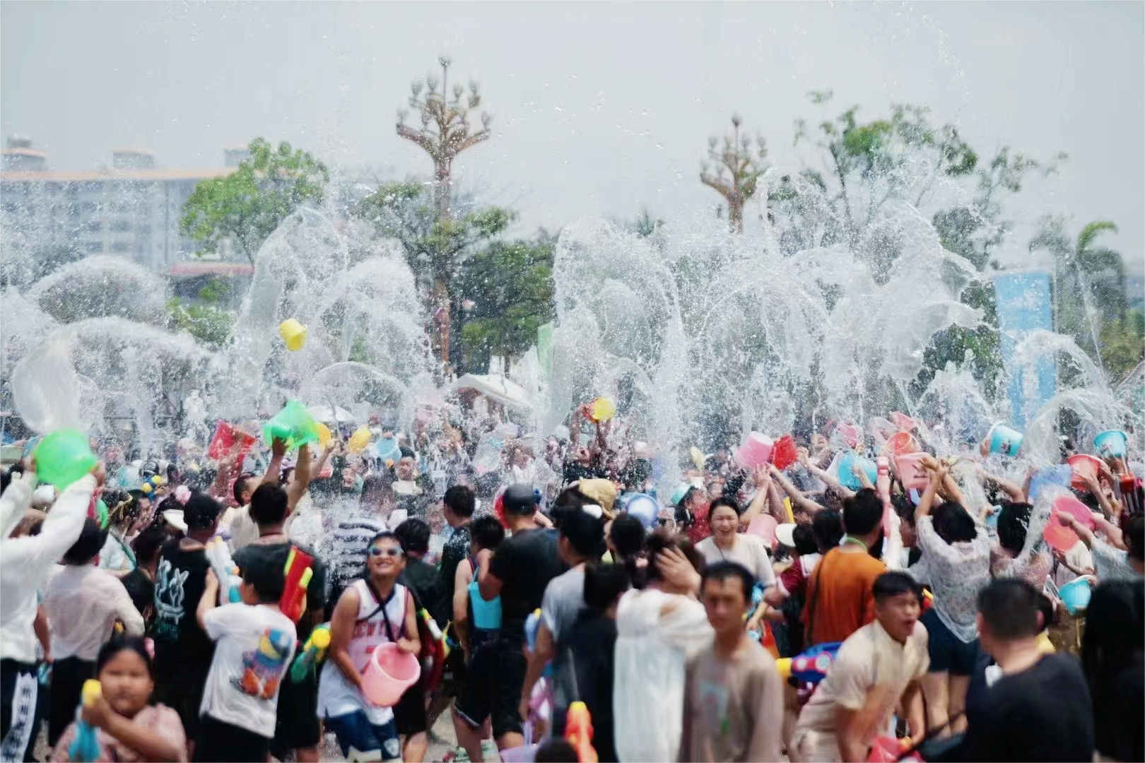 中午飯后大家興高彩烈的加入到潑水和“舞動景谷”的舞會當中,大人、小孩歡聲笑語不停。潑水節是一個撒歡兒狂歡激情的節日,一個淳樸自然豐富的節日,寄托了傣族人民的祈愿,互相潑水意味著把疾病災難不順通通潑掉,被水潑得越濕,代表你收到的祝福越多。